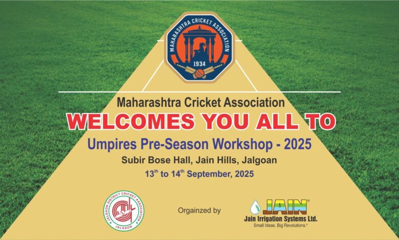 जळगाव दि. १२ प्रतिनिधी – महाराष्ट्र क्रिकेट असोसिएशनतर्फे व जळगाव जिल्हा क्रिकेट असोशिएशन आयोजित क्रिकेट पंचांची कार्यशाळा दि. १३ ते १४ सप्टेंबर २०२५ दरम्यान होणार आहे. जैन हिल्स येथील सुबीर बोस हॉलमध्ये ही कार्यशाळा घेण्यात येईल. जैन इरिगेशन सिस्टीम्स लि. यांच्या सहकार्यातून होत असलेल्या कार्यशाळेला भारतीय क्रिकेट नियामक मंडळाचे पंच संदीप चव्हाण, संदीप गांगुर्डे, मंगेश नार्वेकर मार्गदर्शन करतील.