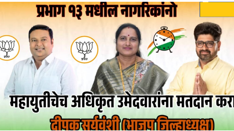 जळगाव – जळगाव महानगरपालिका निवडणुकीत प्रभाग क्रमांक १३ मधील नागरिकांनी महायुतीच्या अधिकृत उमेदवारांनाच मतदान करावे, असे स्पष्ट आवाहन भारतीय जनता पार्टीचे जिल्हाध्यक्ष दिपक सूर्यवंशी यांनी केले आहे.