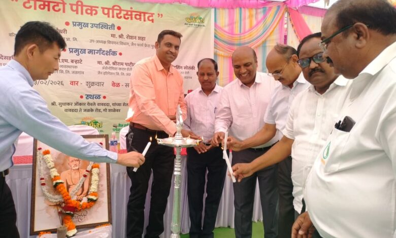 जळगाव दि. १३ (प्रतिनिधी): जैन फार्म फ्रेश फूड्स लि. (जैन इरिगेशन सिस्टीम्सची उपकंपनी) आणि कागोमे इंडिया प्रा. लि. यांच्या संयुक्त विद्यमाने आयोजित ‘टोमॅटो पिक परिसंवाद’ संपन्न झाला. वावडदा-जळके रोडवरील प्रगतशील शेतकरी सुधाकर ओंकार येवले यांच्या शेतात हा कार्यक्रम झाला. शेतकऱ्यांनी मोठ्या संख्येने उपस्थिती लावून या उपक्रमाला उत्स्फूर्त प्रतिसाद दिला. आधुनिक तंत्रज्ञानाच्या साहाय्याने टोमॅटो उत्पादन वाढवण्यासाठी हा परिसंवाद मार्गदर्शक ठरला.