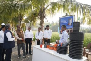 जळगाव येथील जैन हिल्सवर सुरू असलेल्या कृषी महोत्सवास मंत्री नारायण सिंह कुशवाह यांनी आज भेट दिली. जैन इरिगेशनचे वरिष्ठ शास्त्रज्ञ डॉ. अनिल ढाके, डॉ. के. बी. पाटील, डॉ. बी. के. यादव, डॉ. अनिल पाटील, विवेक डांगरीकर, गिरीष कुलकर्णी आणि शास्त्रज्ञांशी त्यांनी संवाद साधला त्यांनी विविध प्रकल्पांची सविस्तर माहिती दिली. यावेळी त्यांच्यासोबत दिल्लीच्या अॅग्री इंडस्ट्रीज विकास चेंर्बस व्यवस्थापकिय संचालक मनोज गुप्ता, मध्यप्रदेशचे भाजपा महामंत्री राघवेंद्र यादव, अरविंद सोनगिरकर, रामविजय यादव उपस्थित होते. जैन ऑटोमेशन, स्मार्ट फिल्टर, न्यूट्रीकेअर, एचडीपीई पाईपसह फिटिंग्जस मधील सर्व उत्पादनांची माहिती त्यांनी घेतली.