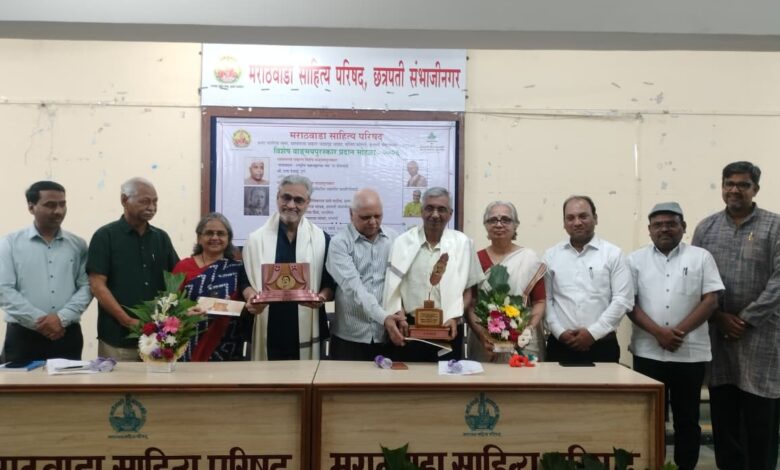 जळगाव, दि12 (प्रतिनिधी) : येथील मराठवाडा साहित्य परिषद, छत्रपती संभाजीनगर आयोजित जैन इरिगेशन सिस्टिम्स लिमिटेड, जळगाव यांच्या प्रायोजकत्वाखाली ‘यशवंतराव चव्हाण विशेष वाङ्मय पुरस्कार’ आणि ‘नटवर्य लोटू पाटील विशेष नाट्य पुरस्कार’ २०२६ प्रदान सोहळा गुरुवार, १२ मार्च रोजी सायंकाळी उत्साहात संपन्न झाला. साहित्य, नाट्य आणि सांस्कृतिक क्षेत्रातील मान्यवरांच्या उपस्थितीत हा कार्यक्रम संपन्न झाला.
